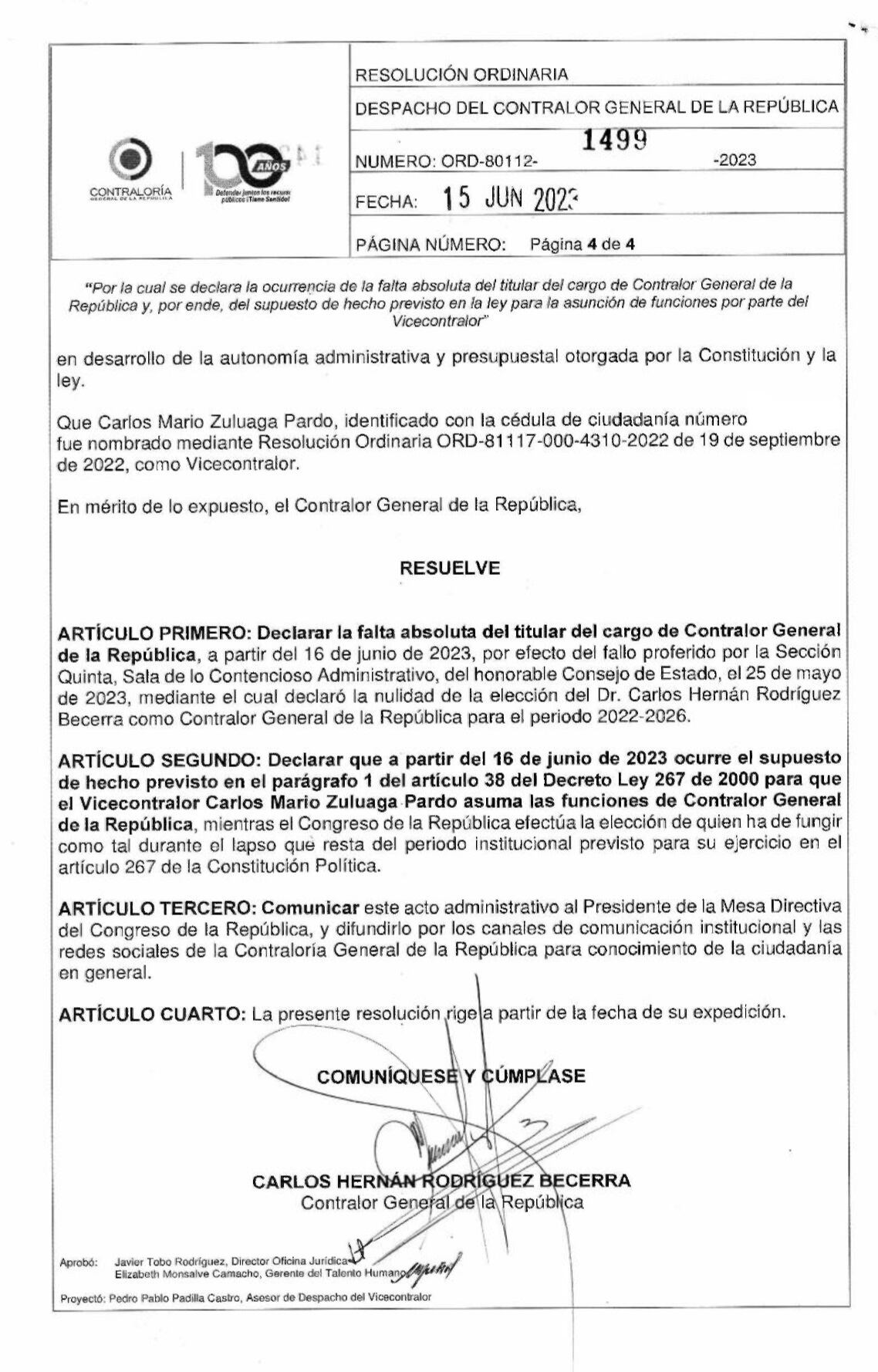 Incluso, la resolución menciona “que el vicecontralor Carlos Mario Zuluaga Pardo asuma las funciones de contralor general de la República, mientras el Congreso de la República efectúa la elección de quien ha de fungir como tal durante el lapso que resta del periodo institucional previsto para su ejercicio en el artículo 267 de la Constitución Política”.