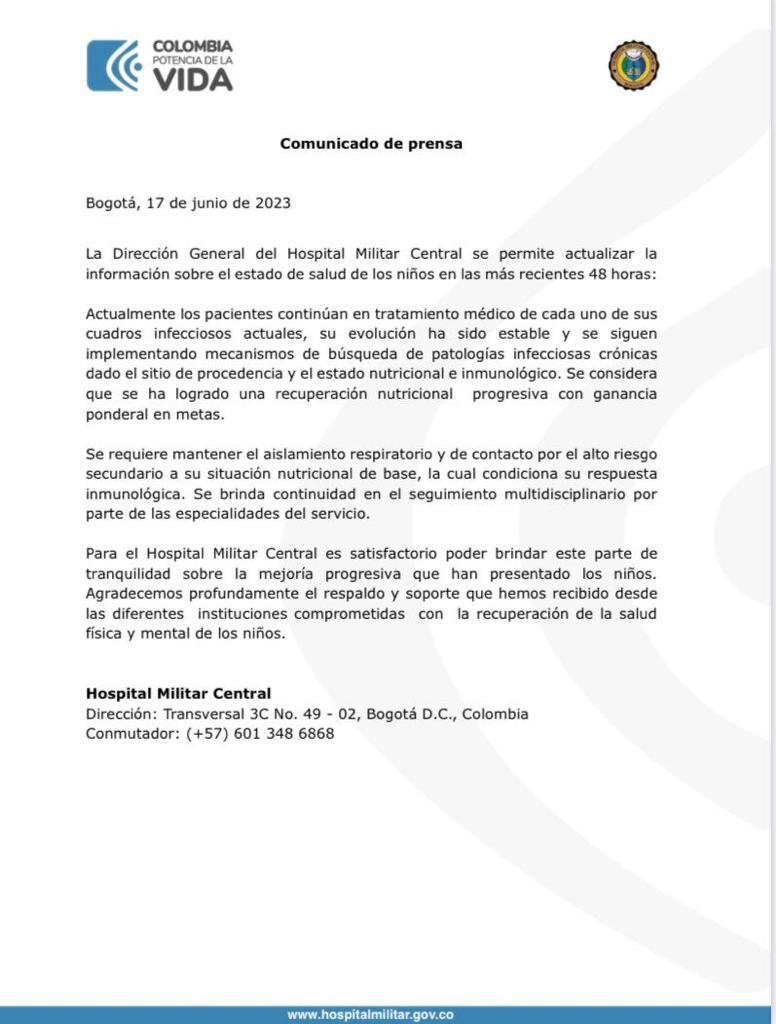 “Para el Hospital Militar Central es satisfactorio poder brindar este parte de tranquilidad sobre la mejoría progresiva que han presentado los niños”, señala el informe médico de este 17 de junio.
