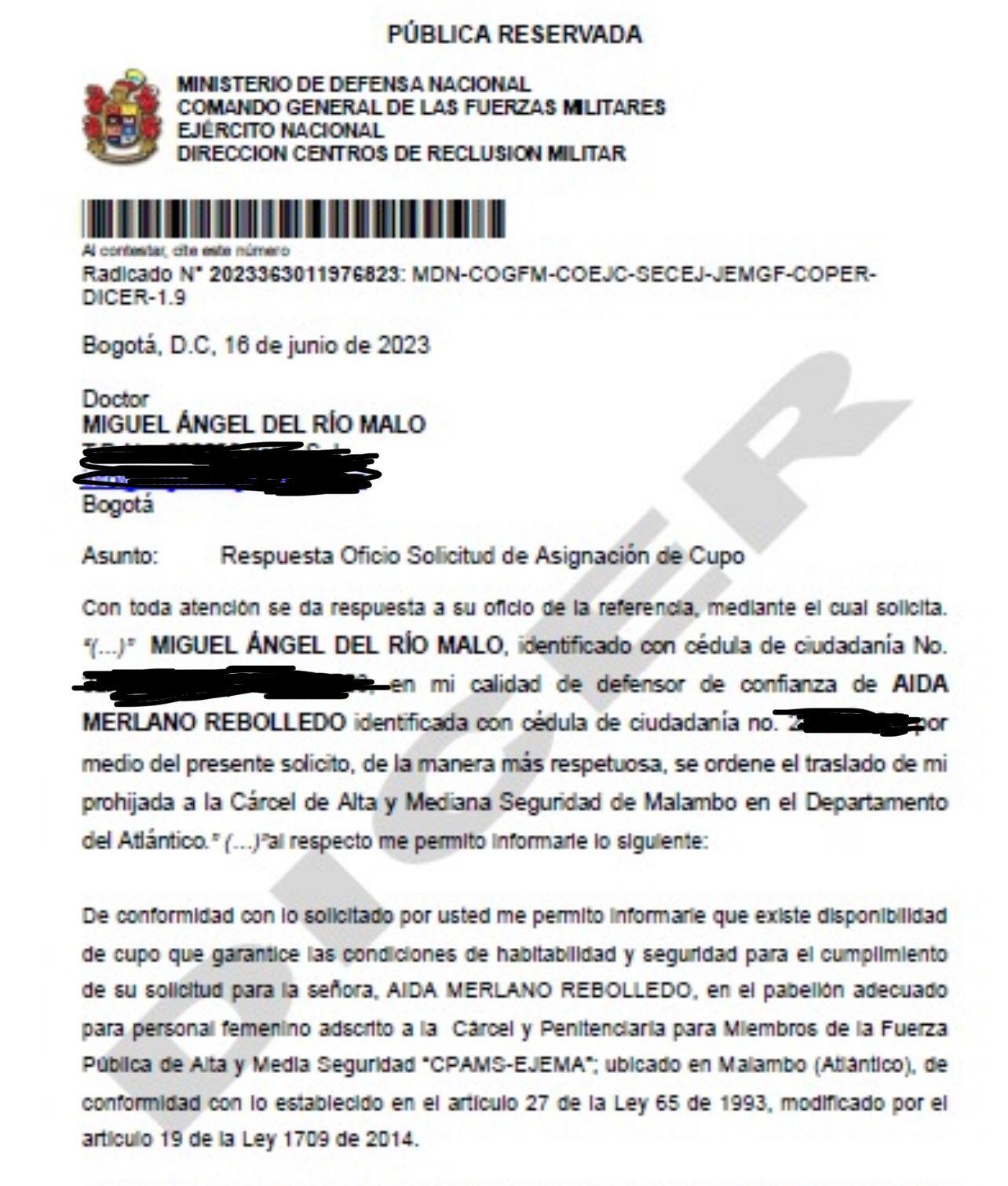 “Teniendo en cuenta la petición elevada por parte de la defensa de la privada de libertad, y la solicitud efectuada ante la Dirección de Centros de Reclusión del Ejercito Nacional para la asignación de un cupo carcelario en un centro de reclusión militar”, expresó el Inpec en un comunicado.