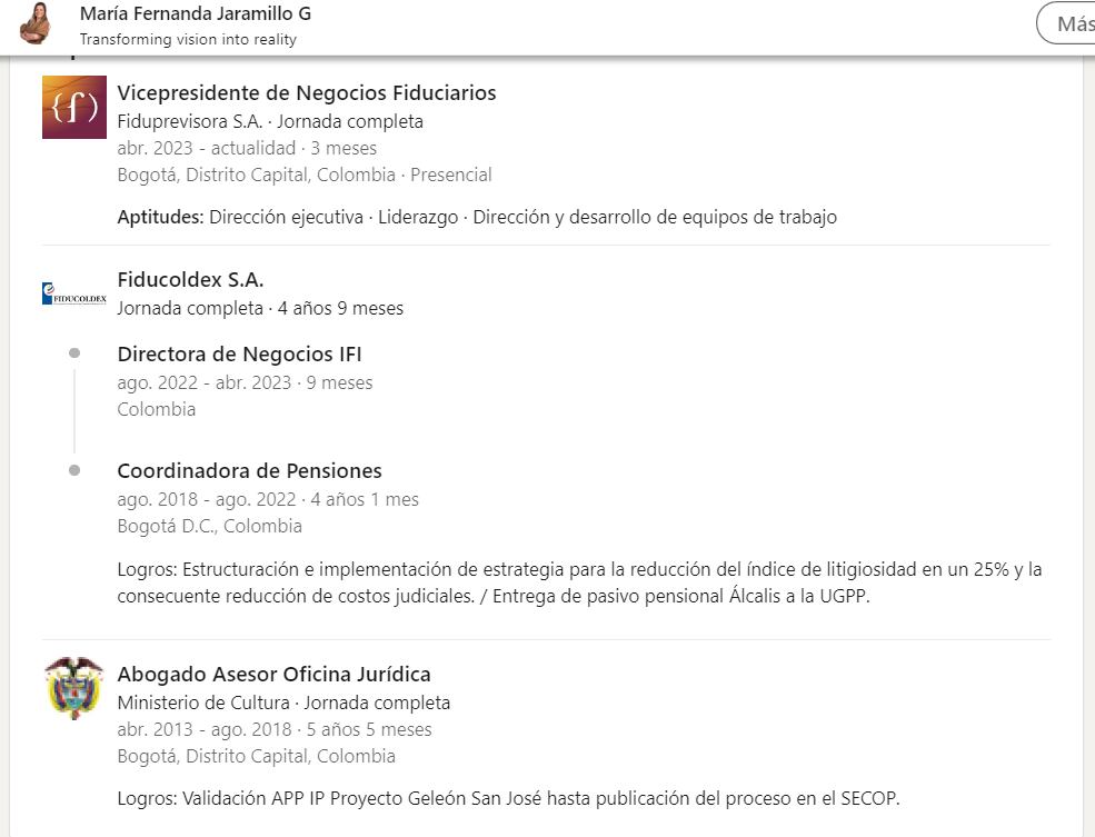 En el caso de las dos vicepresidencias una se nombró a María Fernanda Jaramillo que viene de Fiducoldex de ser directora de negocios fiduciarios. Y agregó que Vanesa Gallego que también tiene amplia experiencia no solo en los temas jurídicos sino fiduciarios.