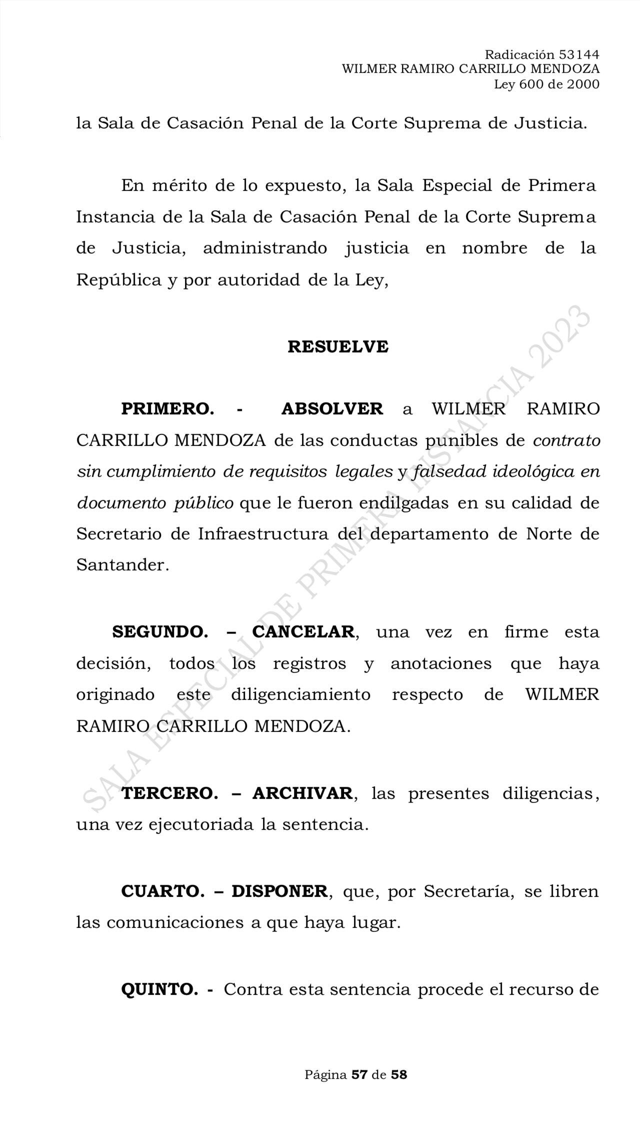 La Sala Especial de Primera Instancia de la Corte Suprema de Justicia absolvió a Wilmer Ramiro Carrillo Mendoza, representante a la Cámara por Norte de Santander, quien en su condición de secretario de Infraestructura fue acusado por la Sala Especial de Instrucción por los posibles delitos de contrato sin cumplimiento de requisitos legales y falsedad ideológica en documento público.