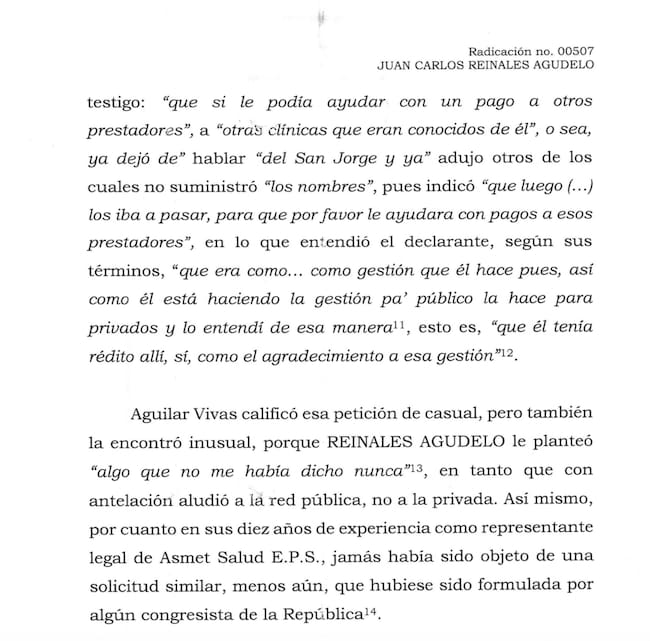 W Radio también conoció la declaración completa de Gustavo Adolfo Aguilar representante legal de Asmet Salud, quien relató que conoció al exrepresentante Reinales en febrero a raíz de una invitación para asistir a la Comisión Séptima, y que supuestamente la preocupación de Reinales era que Asmet Salud volviera a utilizar los servicios de salud del Hospital Universitario San Jorge, cuya facturación había menguado por el retiro del contrato.