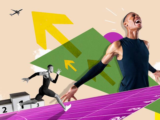 Collage of athlete sprinting on track and celebrating success. / We Are