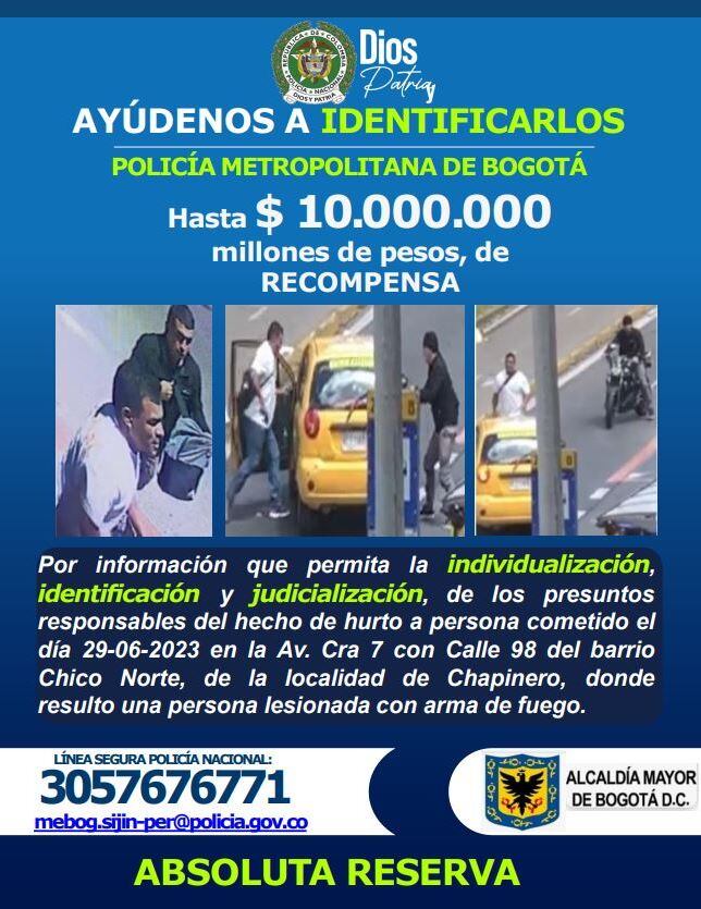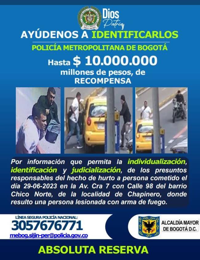 Este 30 de junio, la Policía Metropolitana de Bogotá publicó un cartel con fotografías de los hombres que estuvieron involucrados en el robo de un taxi el pasado jueves 29 de junio en la carrera Séptima con calle 98 de Bogotá.