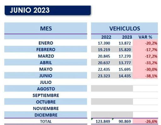 Sin embargo, durante el mes de junio, las matrículas de vehículos registraron una caída del 38,1% en comparación con el mismo mes para el 2022, siendo la mayor disminución mensual en lo que va del año.