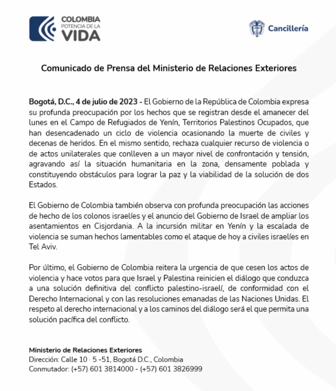 “El Gobierno de la República de Colombia expresa su profunda preocupación por los hechos que se registran desde el amanecer del lunes en el Campo de Refugiados de Yenín, Territorios Palestinos Ocupados, que han desencadenado un ciclo de violencia ocasionando la muerte de civiles y decenas de heridos”, dice el comunicado firmado por el Ministerio de Relaciones Exteriores.