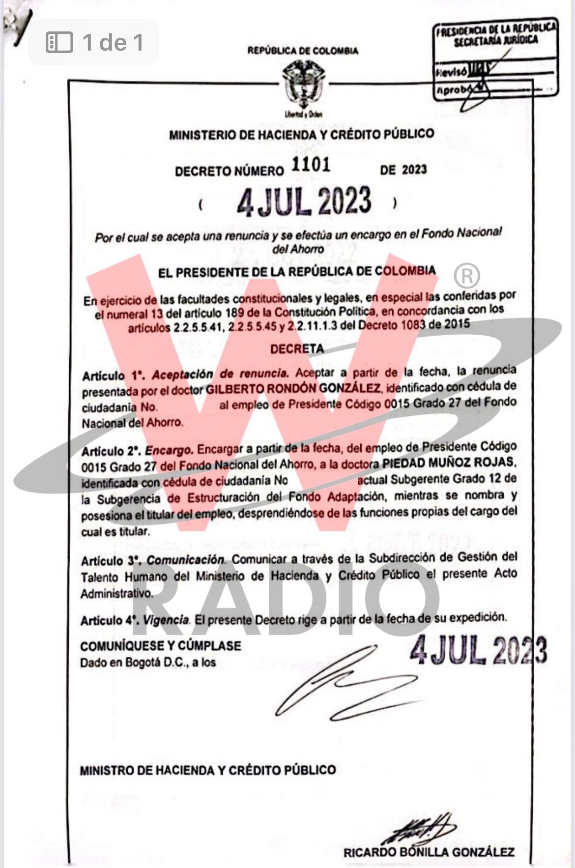 W Radio conoció que ya quedó listo el decreto 1101 que acepta la renuncia de Gilberto Rondón como presidente del Fondo Nacional del Ahorro FNA, por haber recibido más de 200 hojas de vida de 19 congresistas del Partido Liberal con el fin de contratar personas cercanas en la entidad.