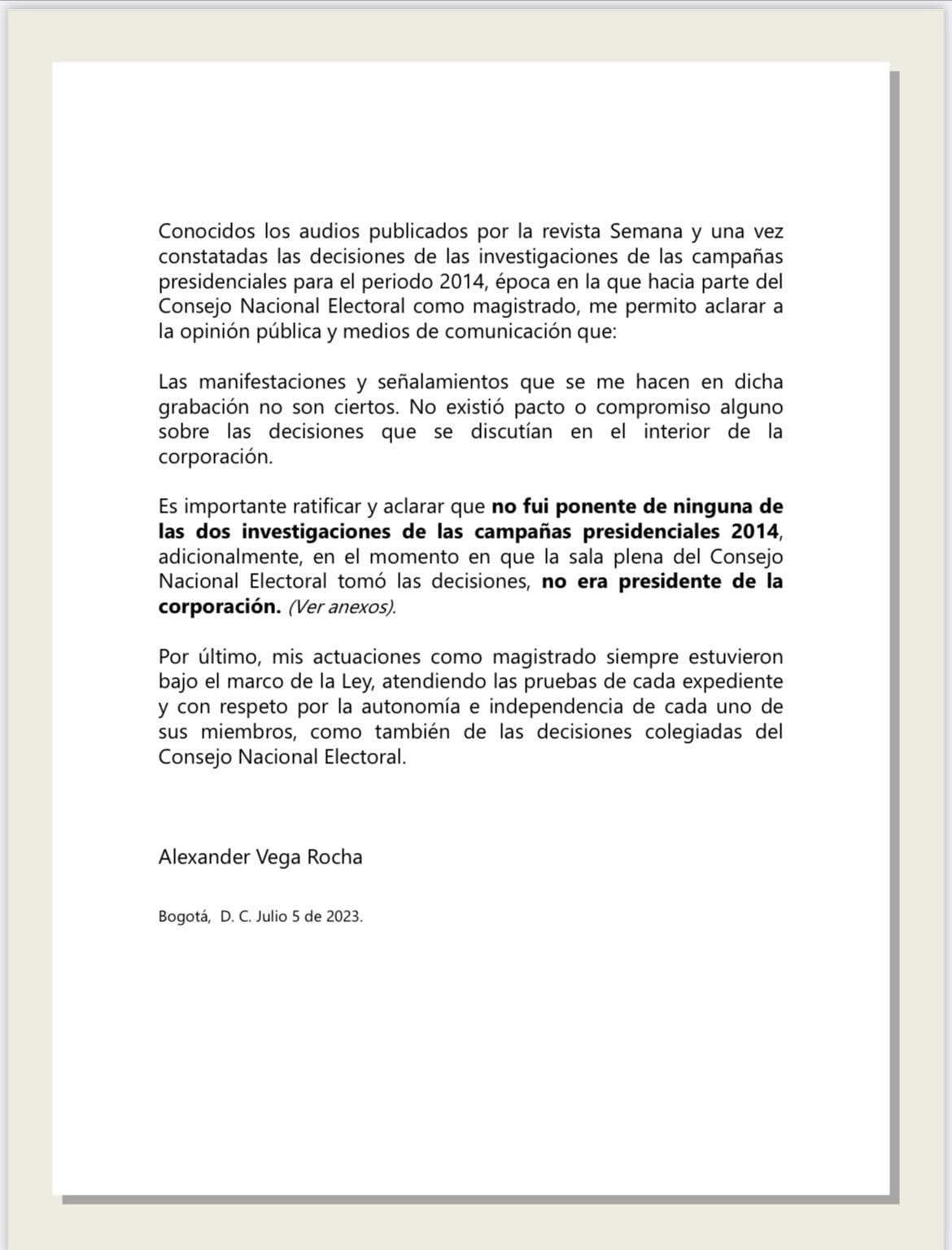 Posteriormente, añadió que “es importante ratificar y aclarar que no fui ponente de ninguna de las dos investigaciones de las campañas presidenciales en 2014, adicionalmente, en el momento en que la sala plena del Consejo Nacional Electoral tomó las decisiones, no era presidente de la corporación”.