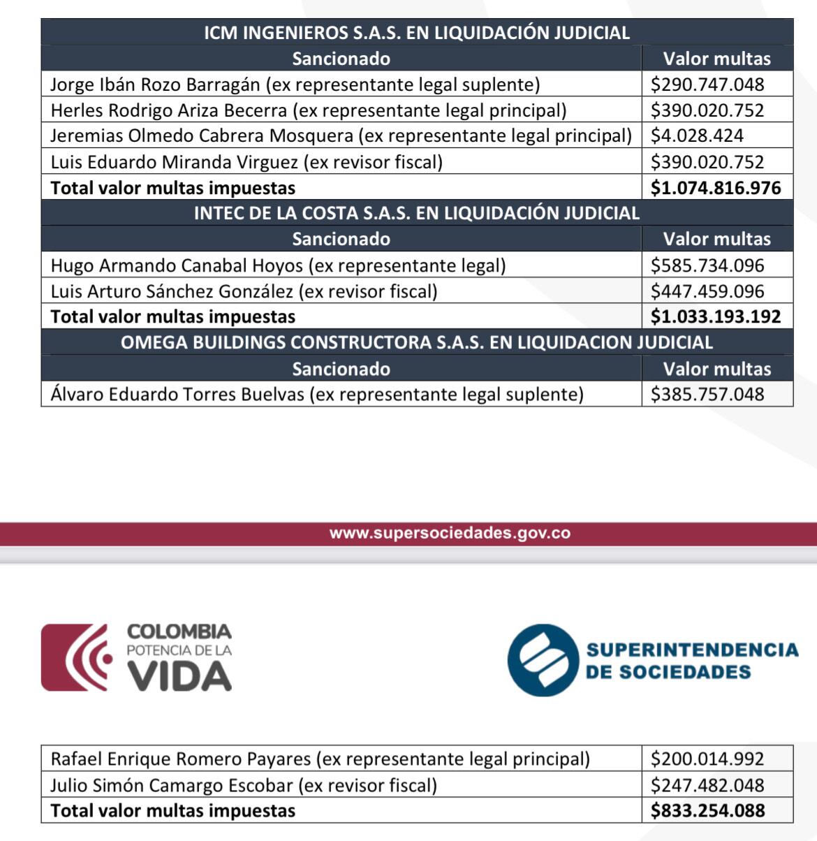 La Superintendencia de Sociedades impuso sanciones por $2.941.264.256 de pesos a estos implicados en el escándalo de Centros Poblados tras realizar visitas y requerimientos de información, así como constatar la renuencia de los respectivos exadministradores y exrevisores fiscales.