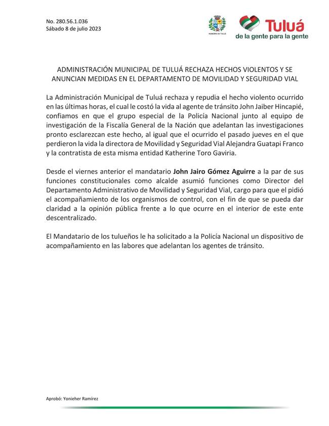 El hecho se da tres días después del asesinato de la directora de Movilidad de Tuluá, Alejandra Guatapí Franco, y de la contratista de la misma dependencia Katherine Toro, quienes fueron atacadas por sicarios cuando se movilizaban en un vehículo particular.