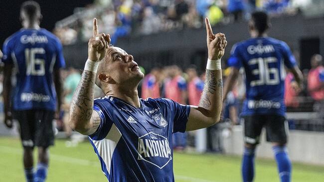 El delantero de Millonarios Leonardo Castro celebra su gol ante Atlético Nacional en Miami. Foto: Twitter @MillosFCoficial