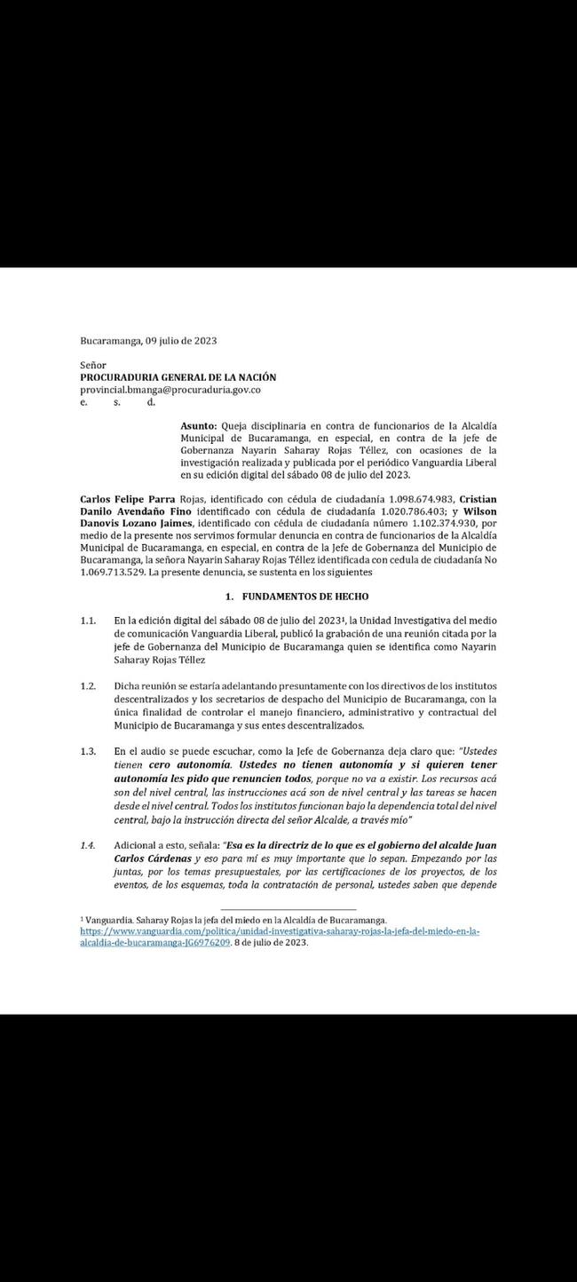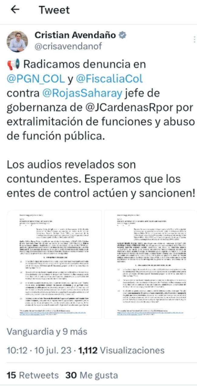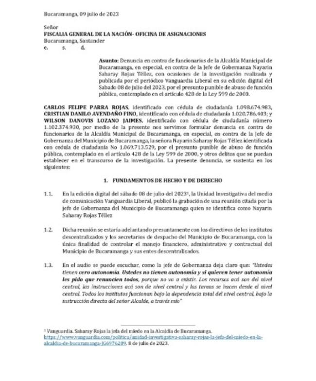 El representante a la Cámara Cristian Avendaño radicó una denuncia disciplinaria ante la Procuraduría General, y una penal ante la Fiscalía General contra la jefe de Gobernanza de la Alcaldía de Bucaramanga, Saharay Rojas, por el presunta extralimitación de funciones.