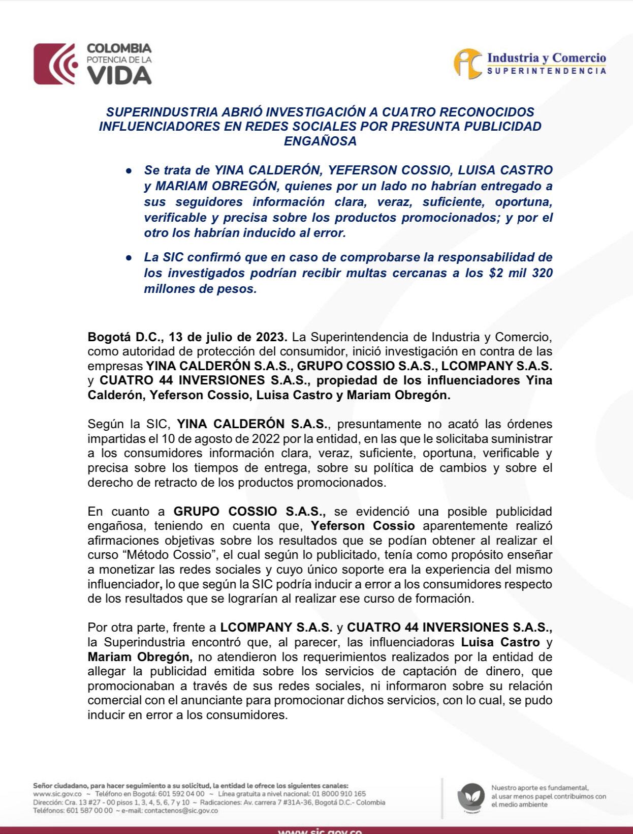 Se trata de Yina Calderon, Yeferson Cossio, Luisa Castro y Mariam Obregón quienes no habrían entregado a sus seguidores información clara, veraz y suficiente, sobre productos promocionados en sus redes sociales.