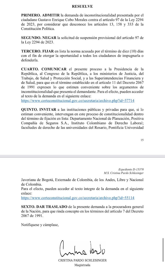 W Radio confirmó que la Corte Constitucional admitió una demanda de Fasecolda al Artículo 97 de la ley 2294 del Plan Nacional de Desarrollo (PND) que obliga a los trabajadores del Estado a afiliarse a la administradora de riesgos Positiva Seguros S.A.
