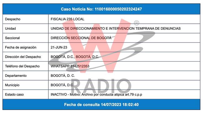 Según se conoció la Fiscalía 235 local de la Unidad de Direccionamiento e Intervención Temprana de Denuncias de la Dirección Seccional de Bogotá archivó por conducta atípica.