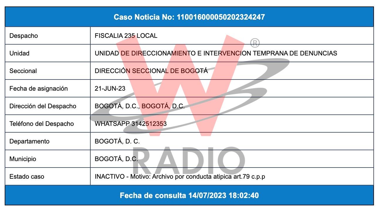 Según se conoció la Fiscalía 235 local de la Unidad de Direccionamiento e Intervención Temprana de Denuncias de la Dirección Seccional de Bogotá archivó por conducta atípica.