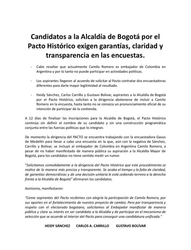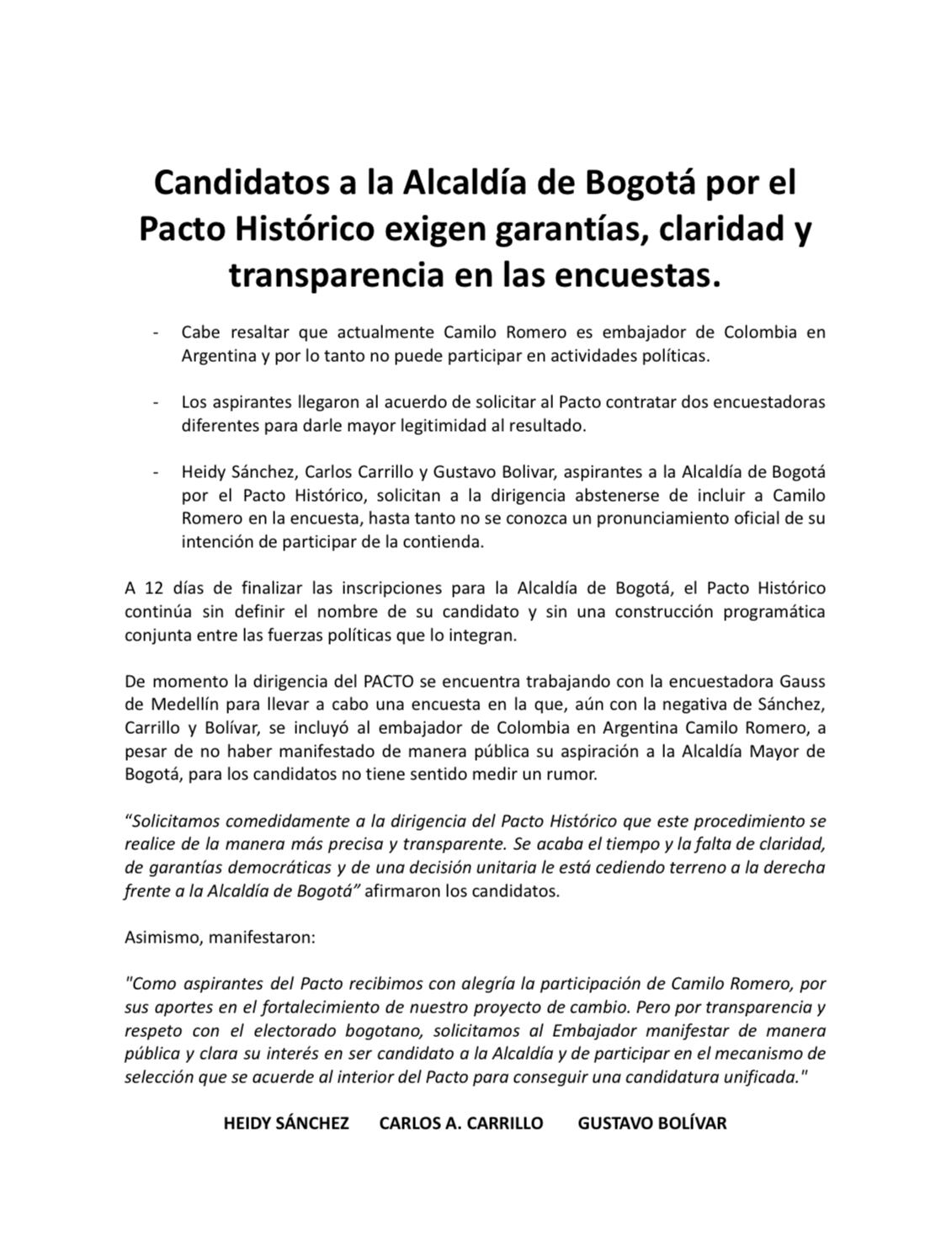 “Por transparencia y respeto con el electorado bogotano, solicitamos al embajador manifestar de manera pública y clara su interés en ser candidato a la Alcaldía y de participar en el mecanismo de selección que se acuerde al interior del Pacto para conseguir una candidatura unificada”.