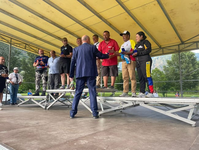 El equipo 'Remando por la Paz' recibió una condecoración al mérito deportivo por parte de Danilo Barmaz, presidente de la World Rafting Federation, por su destacable aporte en la construcción de paz a través de este deporte extremo. | Foto: cortesía Caguán Expedition