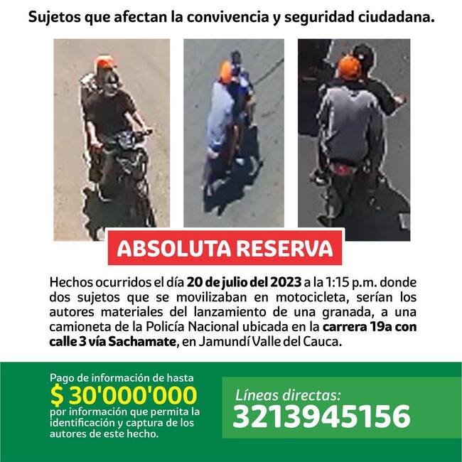 En un cartel divulgado por las autoridades de Jamundí, aparecen tres fotografías de los presuntos responsables de lanzar una granada contra una camioneta de la Policía el pasado 20 de julio en una zona residencial, la cual no explotó, por lo que debió ser detonada de manera controlada por personal de antiexplosivos