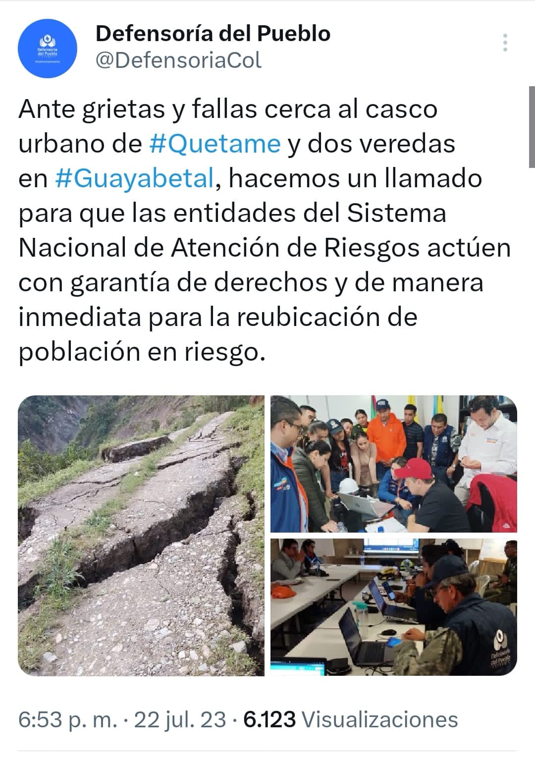 Gran confusión generó en la comunidad atendida por la emergencia en Quetame, Cundinamarca, la aparición de un funcionario delegado por la Defensoría del Pueblo del departamento, vestido con lo que sería un camuflado alusivo a las Fuerzas Militares, lo que sería una violación a las normas básicas de neutralidad para quienes ejercen control de los derechos humanos y del Derecho Internacional Humanitario, desde un órgano como la Defensoría del Pueblo.