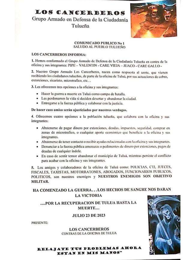En el panfleto se lee, “señores periodistas, les pedimos el favor de publicar nuestros comunicados, que a partir de hoy les estarán llegando muy de seguido. Este favor es una obligación de su parte con la comunidad tulueña, y así como ustedes publican comunicados de la oficina están en el deber de publicar los nuestros”.