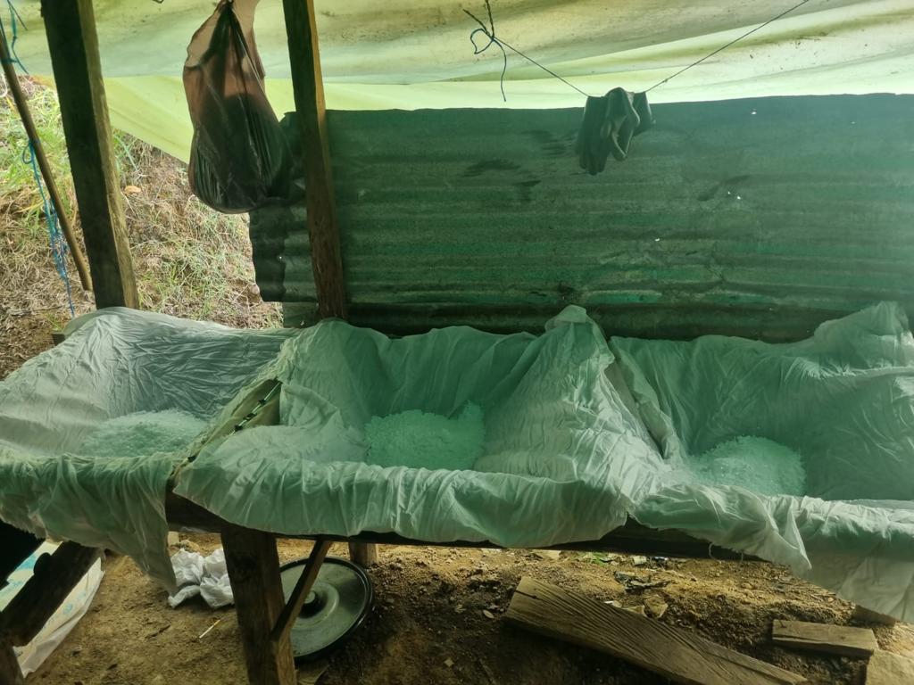 “En el Norte de Santander fueron ubicados tres laboratorios más, dos en la vereda El Porvenir, del municipio de El Tarra, donde se encontraron 1.000 kilogramos de clorhidrato de cocaína, 476 kilogramos de pasta base de coca, 2.671 galones de insumos líquidos y 1.000 kilogramos de insumos sólidos que pertenecerían al ELN, Frente Héctor. En el segundo laboratorio se ubicaron 1.552 kilogramos de clorhidrato de cocaína, 513 kilogramos de pasta base coca, 2782 galones de insumos líquidos, 1250 kilogramos de insumos sólidos, que pertenecerían al GAO-r Estructura 33″.