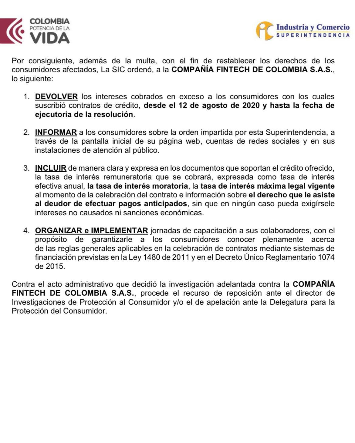 También le ordenó devolver los intereses cobrados en exceso a los consumidores con los cuales suscribió contratos de crédito, desde el 12 de agosto de 2020 y hasta la fecha de ejecutoria de la resolución, teniendo como punto de referencia el interés máximo legal fijado por la Superintendencia Financiera de Colombia.