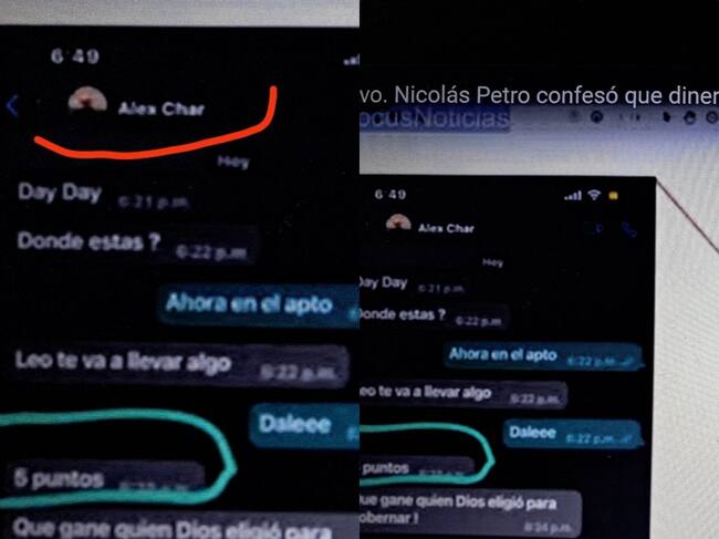 En medio de la audiencia que se realizó este jueves por el caso de Nicolás Petro y su excompañera sentimental, se mostró un chat a nombre del actual candidato a la Alcaldía de Barranquilla, Alejandro Char, en el que hacía referencia a “5 puntos” que se le entregarían a Dayssuris Vásquez en su apartamento por parte de una tercera persona, sin que se tenga claridad sobre a qué se refería.