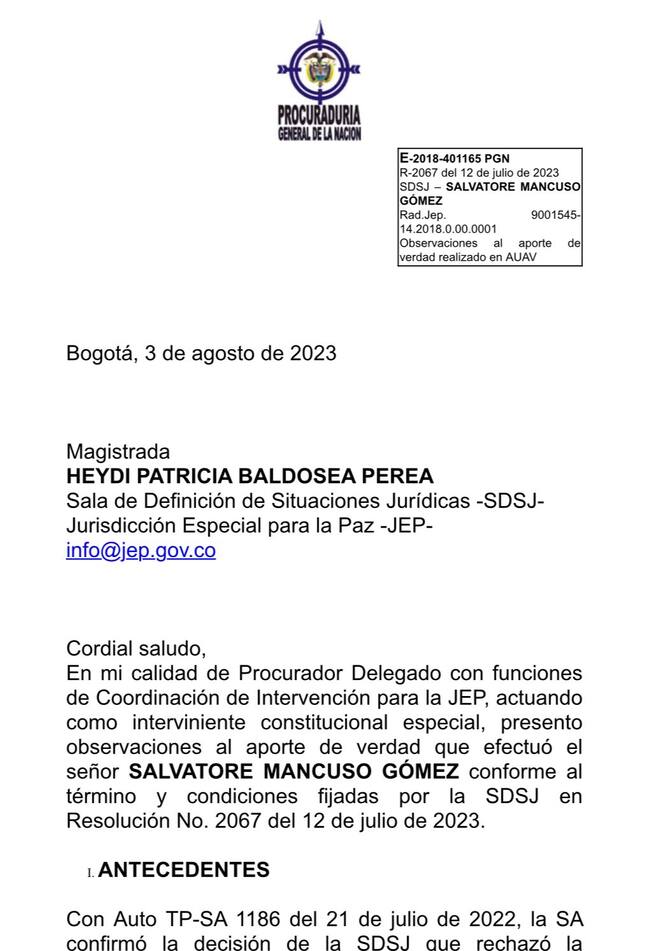La W conoció en exclusiva por fuentes en la JEP, el documento en el que la Procuraduría General de la Nación le solicitó formalmente a esa jurisdicción aceptar el sometimiento del excomandante de las Autodefensas Unidas de Colombia, Salvatore Mancuso Gómez.