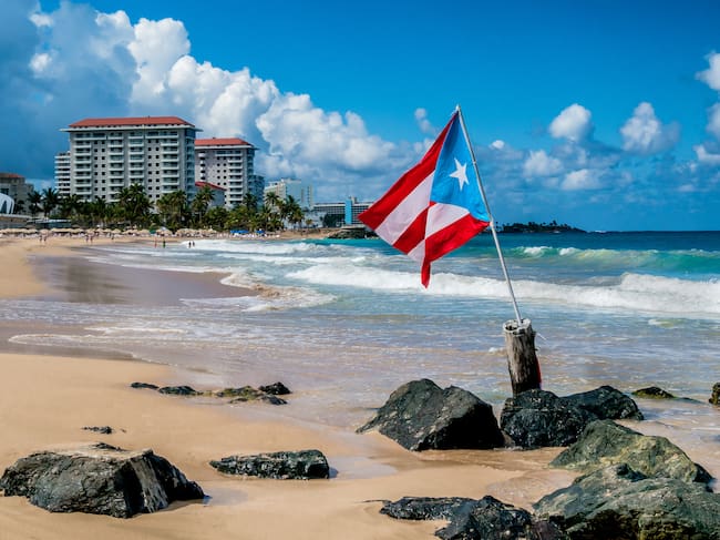 Bandera nacional de Puerto Rico incrustada en la playa San Juan / Foto: Getty Images / John Piekos