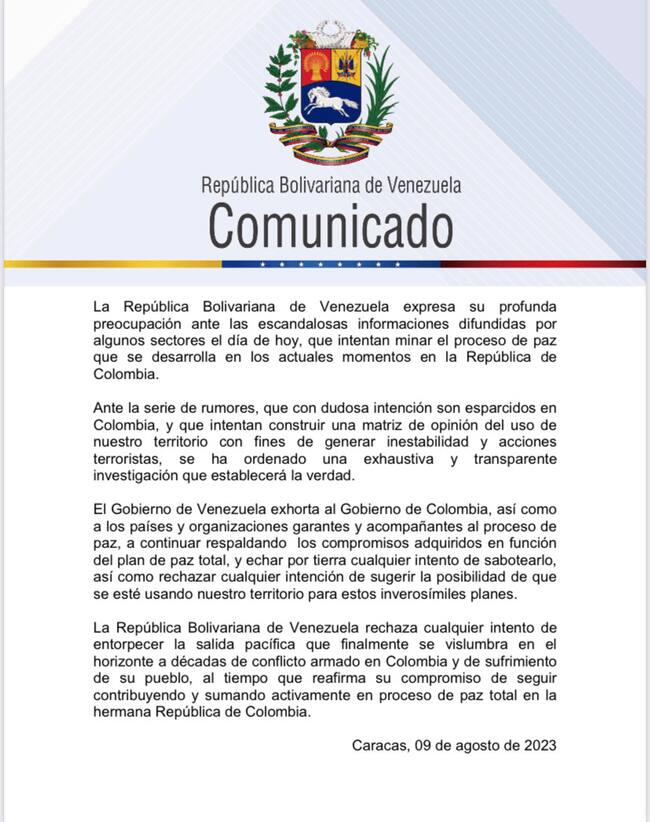 El comunicado surge en respuesta a las denuncias sobre un supuesto plan del ELN para atacar al fiscal general de la Nación, Francisco Barbosa. El Gobierno de Venezuela explicó en el documento emitido por la Cancillería que, “ante la serie de rumores, que con dudosa intención son esparcidos en Colombia, y que intentan construir una matriz de opinión del uso de nuestro territorio con fines de generar inestabilidad y acciones terroristas, se ha ordenado una exhaustiva y transparente investigación que establecerá la verdad”.