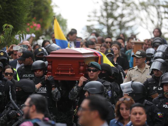 AME9921. QUITO (ECUADOR), 11/08/2023.- Miembros de la Policía cargan el féretro del candidato presidencial Fernando Villavicencio rumbo a su entierro hoy, en Quito (Ecuador). El féretro con el cuerpo de Villavicencio, el candidato a la Presidencia de Ecuador que fue asesinado el pasado miércoles, salió en un carro fúnebre acompañado de la familia rumbo al cementerio en el norte de Quito donde será inhumado este mismo viernes. EFE/ José Jácome / Jose Jacome (EFE)