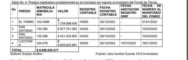 Otro asunto que llama poderosamente la atención es que la ANT registró 252 predios al inventario de bienes del Fondo de Tierras para reforma rural integral con un valor de 0 pesos.