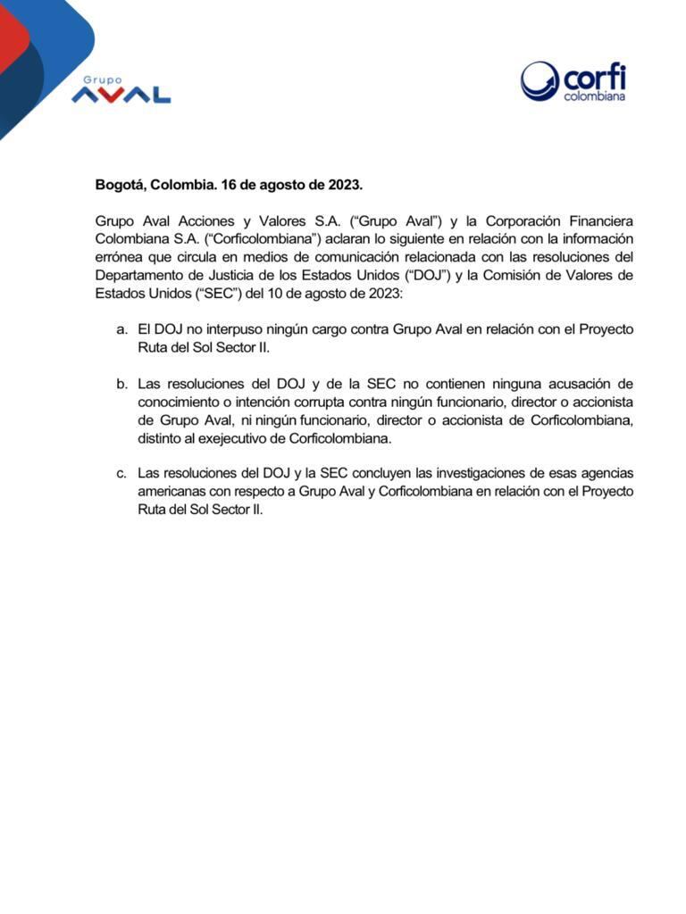 Agrega que “las resoluciones del DOJ y de la SEC no contienen ninguna acusación de conocimiento o intención corrupta contra ningún funcionario, director o accionista de Grupo Aval, ni ningún funcionario, director o accionista de Corficolombiana, distinto al exejecutivo de Corficolombiana”.
