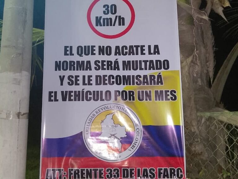 Señala una de los pendones “velocidad máxima de 30 kilómetros por hora, el que no acate la norma será multado y se le decomisará el vehículo por un mes”, señala el frente 33 de las Farc.