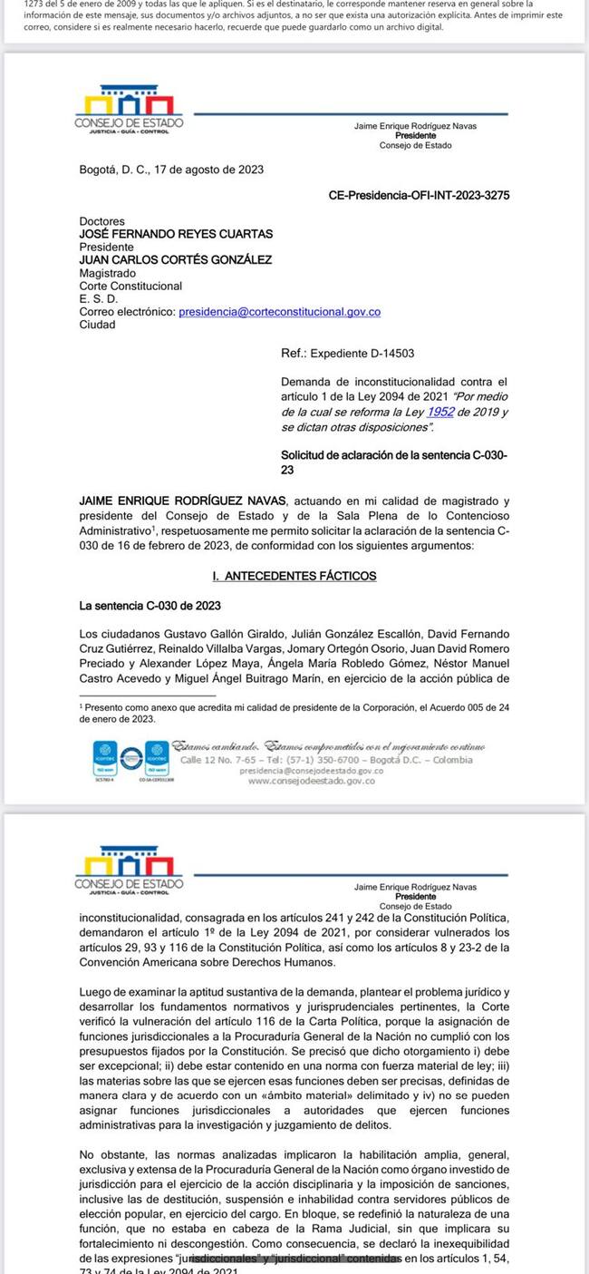 El presidente del Consejo de Estado, Jaime Enrique Rodríguez escaló esta solicitud a los ponentes del fallo, los magistrados José Fernando Reyes y Juan Carlos Cortés.