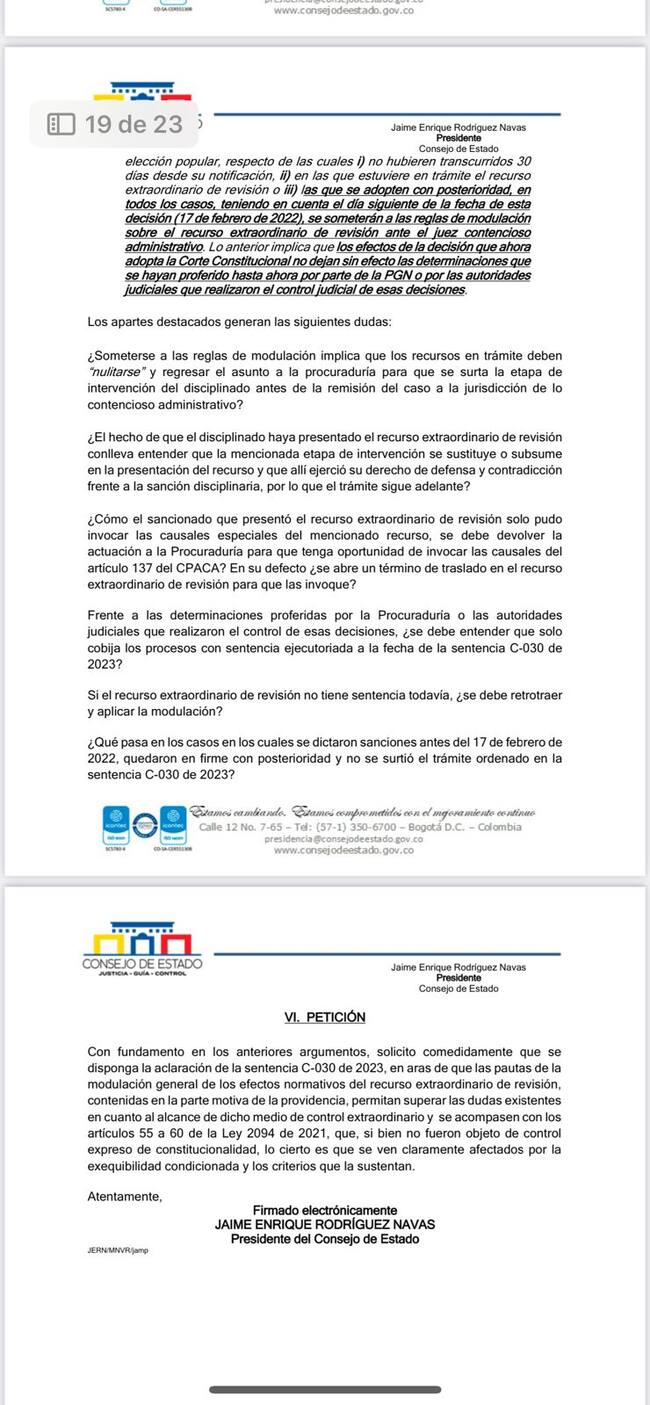 El presidente del Consejo de Estado, Jaime Enrique Rodríguez escaló esta solicitud a los ponentes del fallo, los magistrados José Fernando Reyes y Juan Carlos Cortés.