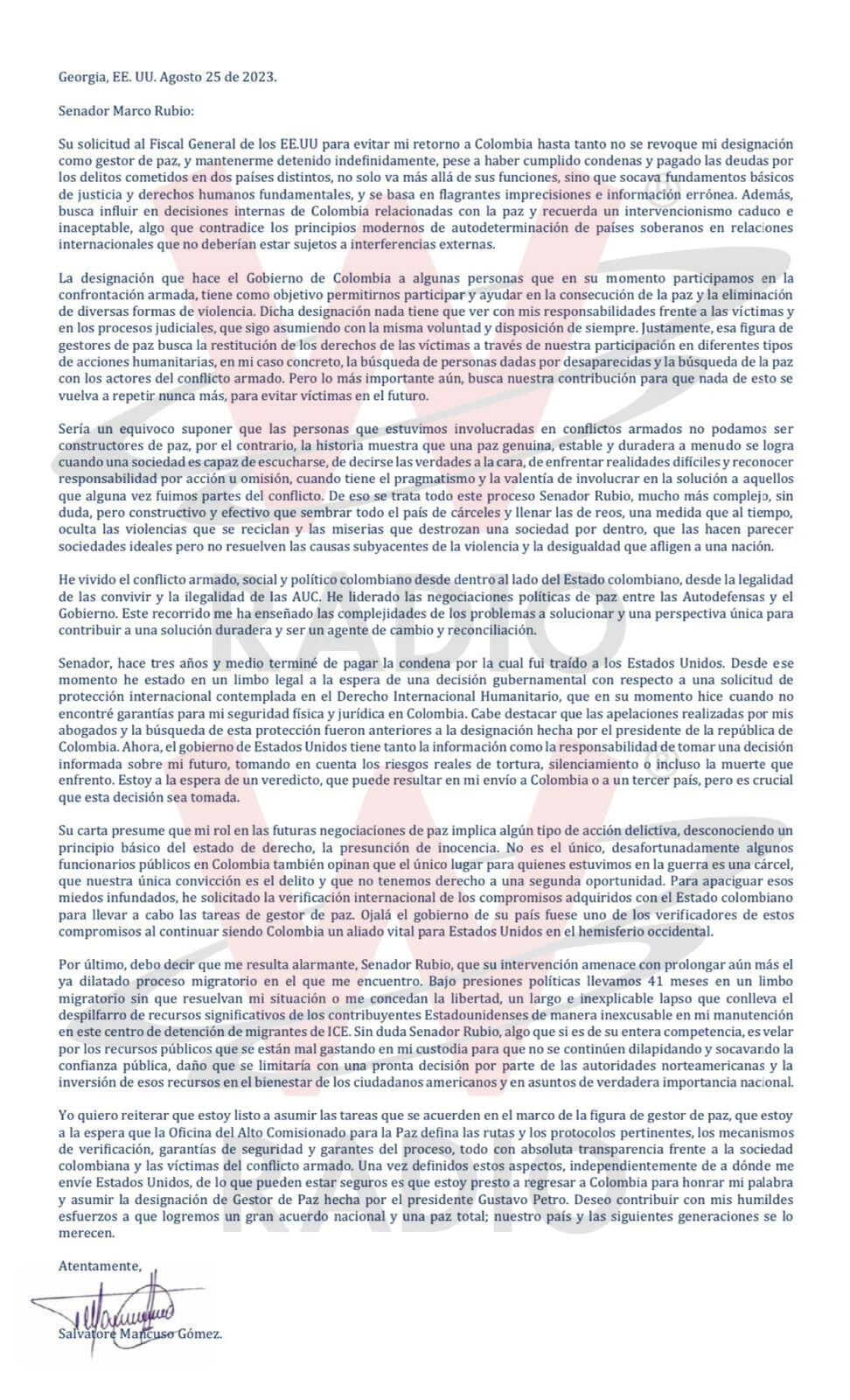 El exjefe paramilitar Salvatore Mancuso, en una carta conocida por La W, le respondió al senador republicano Marco Rubio luego de que este le solicitara al fiscal de los Estados Unidos, Merrick Garland, detener la extradición de Mancuso a Colombia hasta que le sea revocada su condición de gestor de paz.