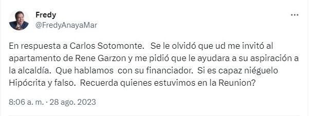 Con un mensaje que escribió, y minutos después eliminó, Fredy Anaya calificó como hipócrita y falso a Sotomonte y señaló que “se le olvidó que usted me invitó al apartamento de René Garzón y me pidió que le ayudara a su aspiración a la alcaldía. Que hablamos con su financiador. Si es capaz, niéguelo, hipócrita y falso. Recuerda quiénes estuvimos en la reunión?”.