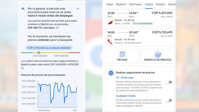 La segunda herramienta es ‘el seguimiento de precios’. Es una opción que le aparecerá cuando busque cualquier destino. Al activar esta opción, Google le mandará notificaciones cuando encuentre que hay una disminución significativa en los precios de los tiquetes. Estos avisos los puede configurar para que sean para fechas específicas, como el viaje para el Día de la Madre, o una notificación genérica para cierto periodo de tiempo, como en los próximos tres meses.