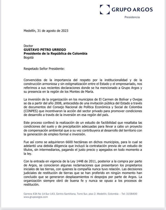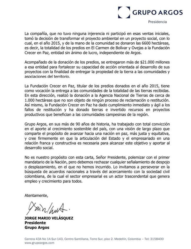 “No es nuestro propósito con esta carta, señor Presidente, polemizar con el primer mandatario de la Nación, pero debemos rechazar cualquier señalamiento de despojo o desplazamiento, en el que no hemos incurrido. Lo invitamos a perseverar en la búsqueda de acuerdos nacionales a través del acercamiento con la sociedad civil colombiana, de la cual el sector empresarial es un actor trascendental que genera empleo y crecimiento para todos”, agrega en la misiva.