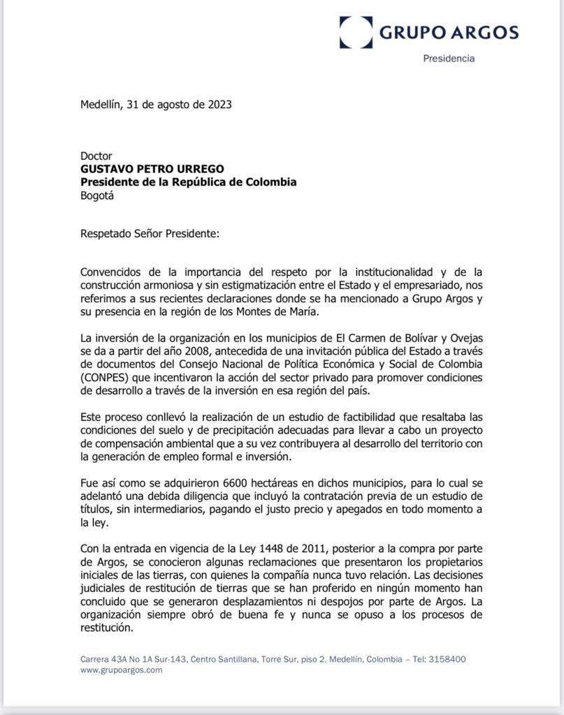 W Radio conoció en primicia la dura carta que Grupo Argos le envió al presidente Gustavo Petro, quien dijo este miércoles que la cementera promovió despojos de tierras en Montes de María.