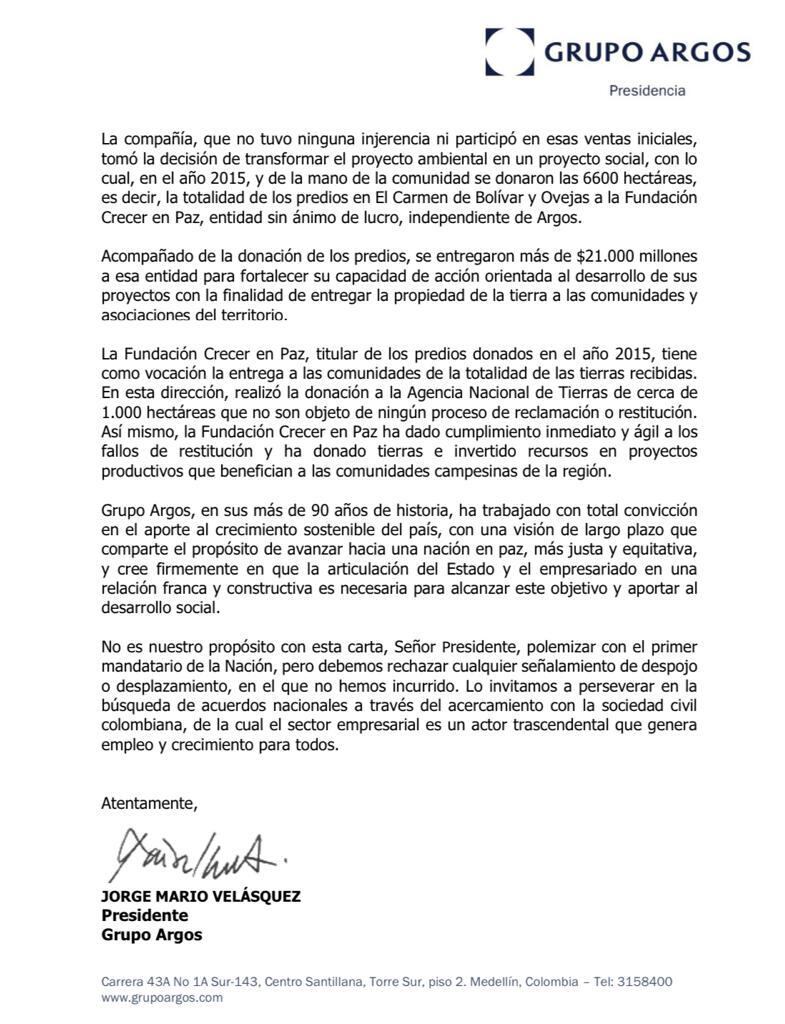“No es nuestro propósito con esta carta, señor Presidente, polemizar con el primer mandatario de la Nación, pero debemos rechazar cualquier señalamiento de despojo o desplazamiento, en el que no hemos incurrido. Lo invitamos a perseverar en la búsqueda de acuerdos nacionales a través del acercamiento con la sociedad civil colombiana, de la cual el sector empresarial es un actor trascendental que genera empleo y crecimiento para todos”, agrega en la misiva.