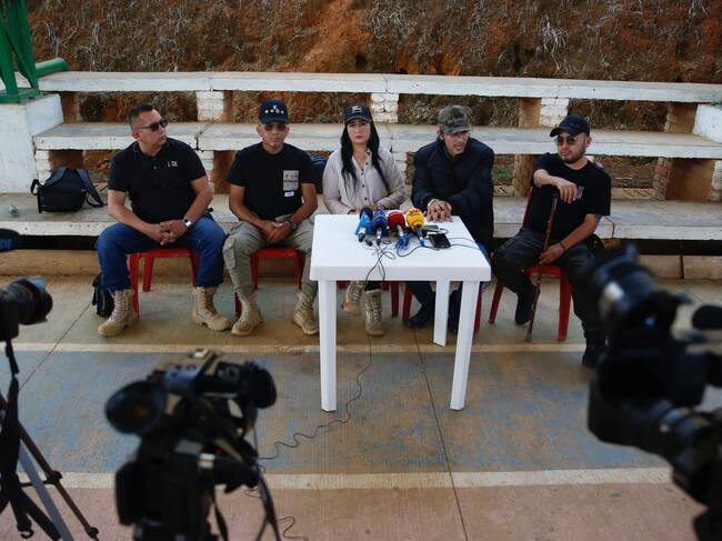 AME6344. SUÁREZ (COLOMBIA), 03/09/2023.- "Andrey Avendaño" (2i), jefe de la delegación de las disidencias de las FARC, habla con los medios de comunicación hoy, en Suárez (Colombia). El Gobierno colombiano y el Estado Mayor Central, la principal disidencia de las FARC, seguirán trabajando después de una primera reunión exploratoria para elaborar un acuerdo de cese al fuego bilateral que esté vigente cuando comiencen las conversaciones formales de paz. EFE/ Ernesto Guzmán / Ernesto Guzmán (EFE)