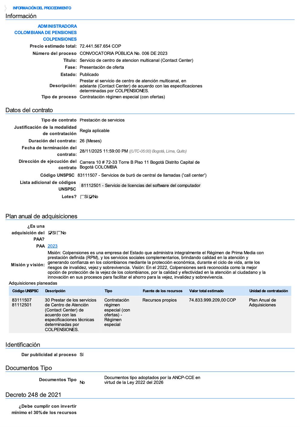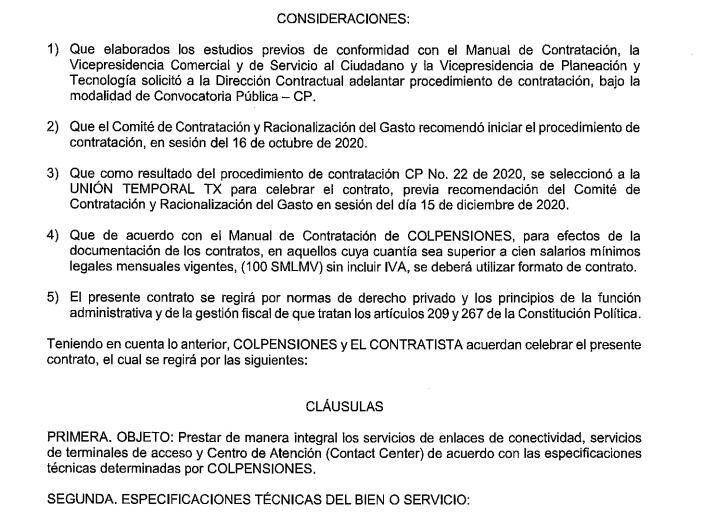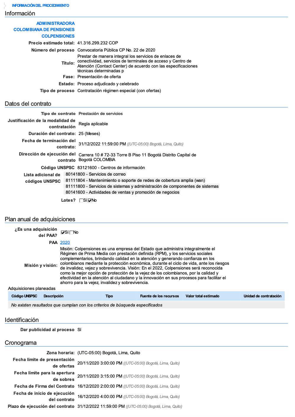 Se trata de la convocatoria pública No 22 de 2020. El precio estimado es de aproximadamente 41.300 millones de pesos y tendría una duración de 25 meses.