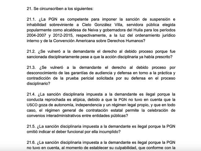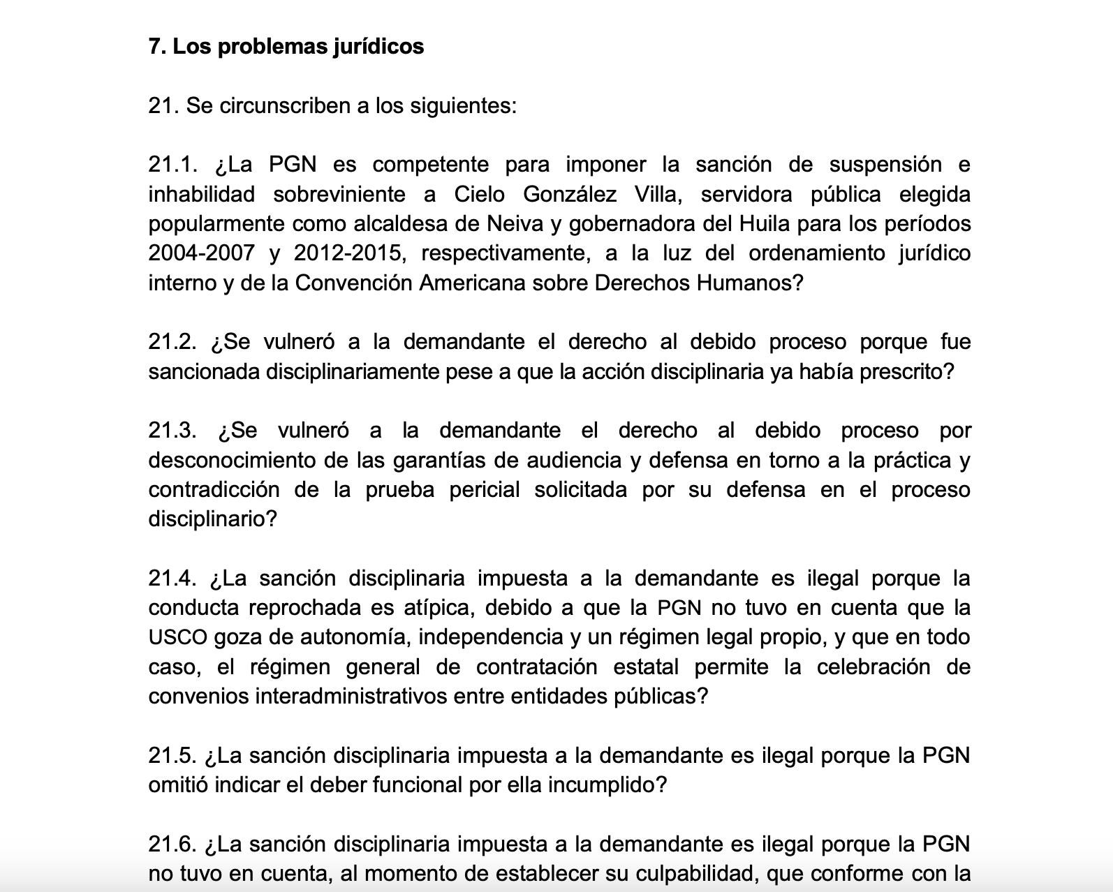 Ahora, lo interesante del fallo es que nuevamente el alto tribunal se cuestiona si la PGN es competente para imponer la sanción de suspensión e inhabilidad sobreviniente a Cielo González Villa, servidora pública elegida popularmente como alcaldesa de Neiva y gobernadora del Huila para los períodos 2004-2007 y 2012-2015, respectivamente, a la luz del ordenamiento jurídico interno y de la Convención Americana sobre Derechos Humanos.