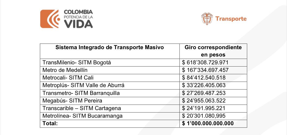 El Gobierno, en cabeza del ministro de Transporte, girará 1 billón de pesos que permitiría cubrir parte del déficit operacional en los Sistemas Integrados de Transporte Masivo (SITM) y será distribuido en donde se encuentran operando: Bogotá, Valle de Aburrá, Barranquilla, Medellín, Cali, Bucaramanga, Cartagena y Pereira.