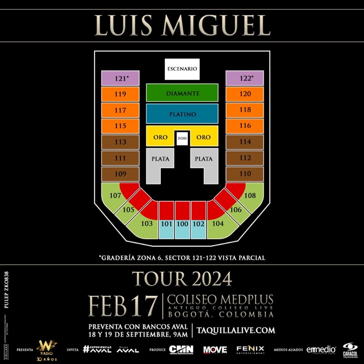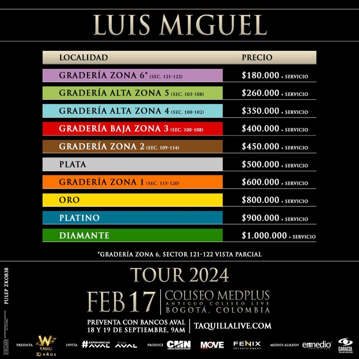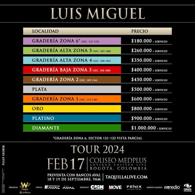 Dentro de la gira, que tendrá paradas en 32 ciudades, Luis Miguel reservó un espacio para sus seguidores en el sur del continente. Colombia hará parte de este reencuentro musical con el show que se realizará el próximo 17 de febrero del 2024 en el Coliseo MedPlus (Coliseo Live) de Bogotá.