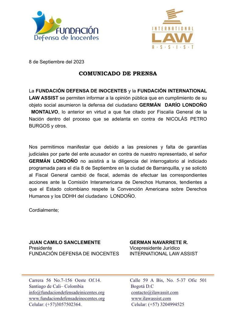 W Radio conoció en primicia la carta de dos páginas y cuatro párrafos en la que German Darío Londoño Montalvo, uno de los primeros citados a interrogatorio por su presunta participación en el supuesto ingreso de dineros al parecer ilegales a la campaña presidencial del Pacto Histórico en la Costa Atlántica, le anuncia al fiscal Mario Burgos que no acudirá hoy a la diligencia que se había programado para este viernes 8 de septiembre.