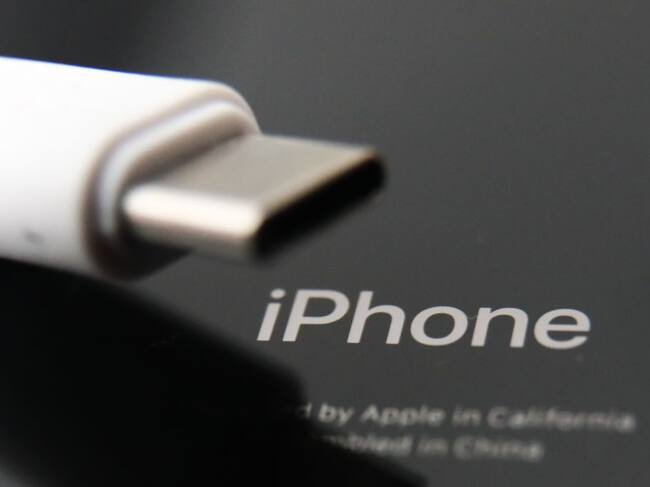 USB-C cable y logo de iPhone. Septiembre 11, 2023. Foto: Jakub Porzycki/NurPhoto via Getty Images.